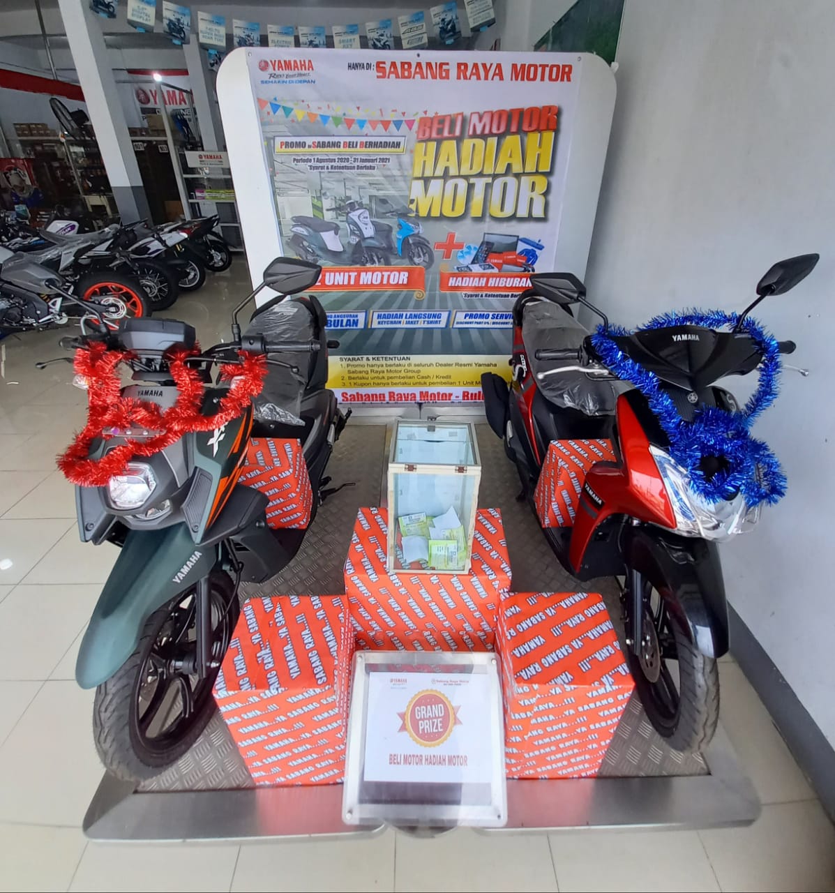 Promo yang disuguhkan bertema PSBB ini yang merupakan singkatan dari Promo di Sabang Beli Berhadiah“BELI MOTOR HADIAH MOTOR” serta beragam Hadiah hiburan lainnya yang khusus diberikan untuk pembelian unit motor Yamaha di Sabang Raya Motor secara Cash ataupun kredit.