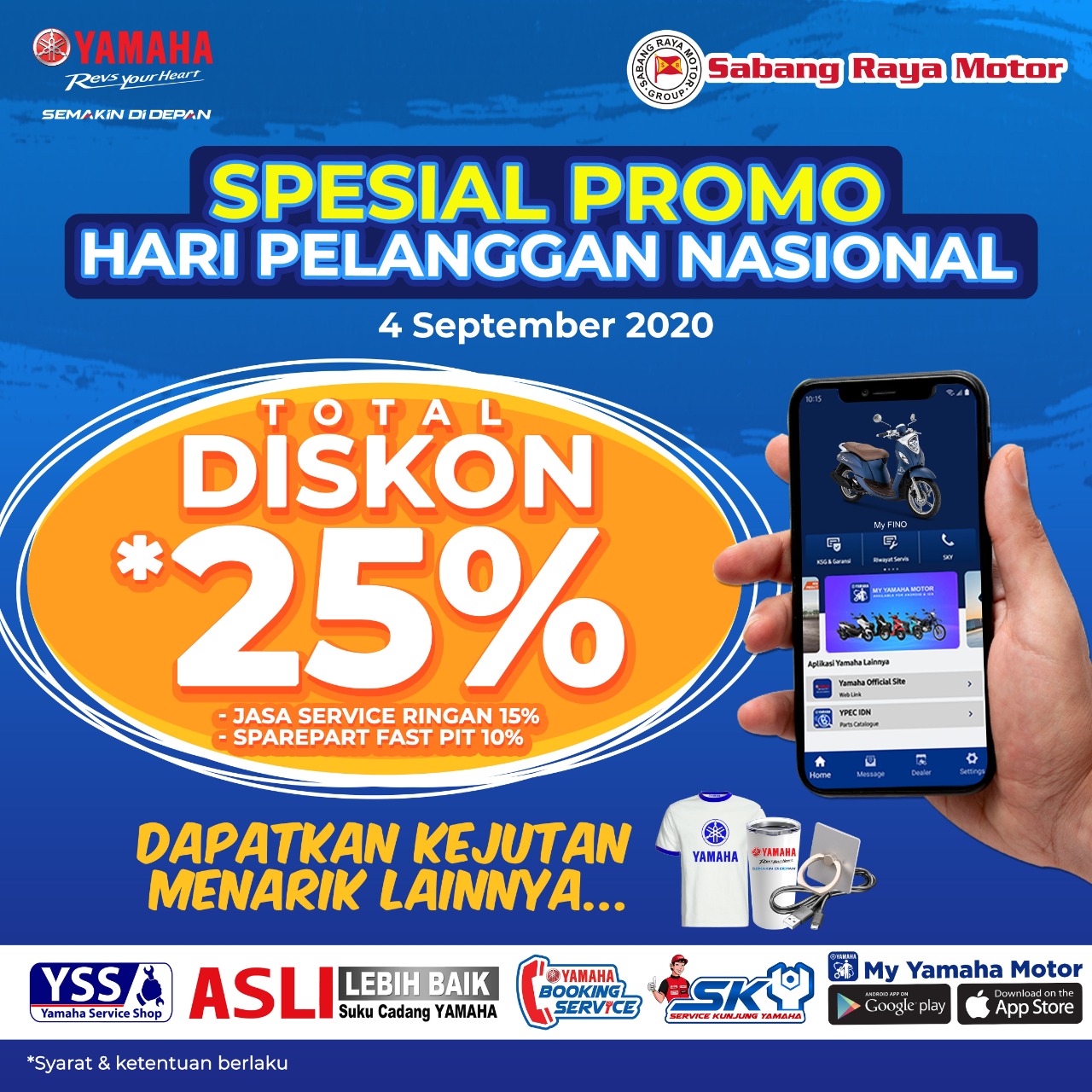 Dalam Rangka Hari Pelanggan Nasinal kami memberikan apresiasi untuk BroSis tercinta berupa *Promo Special Total Diskon 25% khusus untuk BroSis pelanggan setia Yamaha.