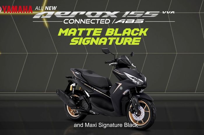 Untuk tipe All New Yamaha Aerox 155 Connected ABS, tersedia dua warna yaitu Matte Black Signature dan Prestige Silver yang dipercantik dengan velg berkelir emas.